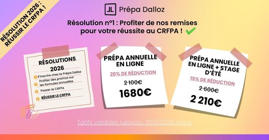 La Prépa Dalloz vous facilite la vie en vous proposant de régler votre prépa annuelle CRFPA en cinq fois sans frais (l’acompte puis 4 versements).